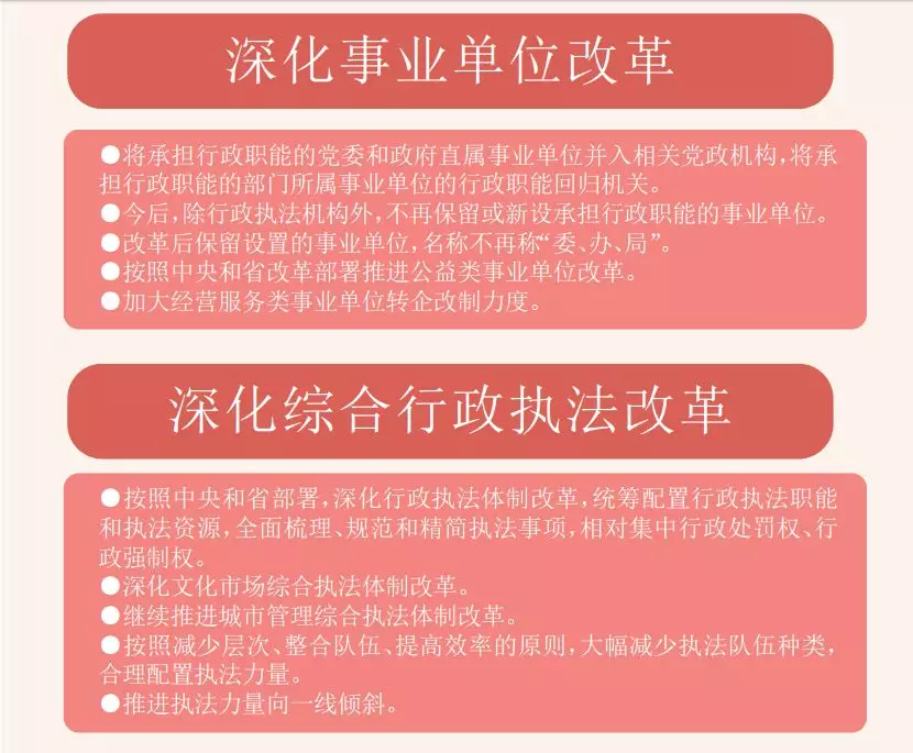 三是坚决落实中央、省委和市委决策部署。着力完善维护党中央权威和集中统一领导的体制机制,机构职能做到上下基本对应,不折不扣落实好各项改革任务。