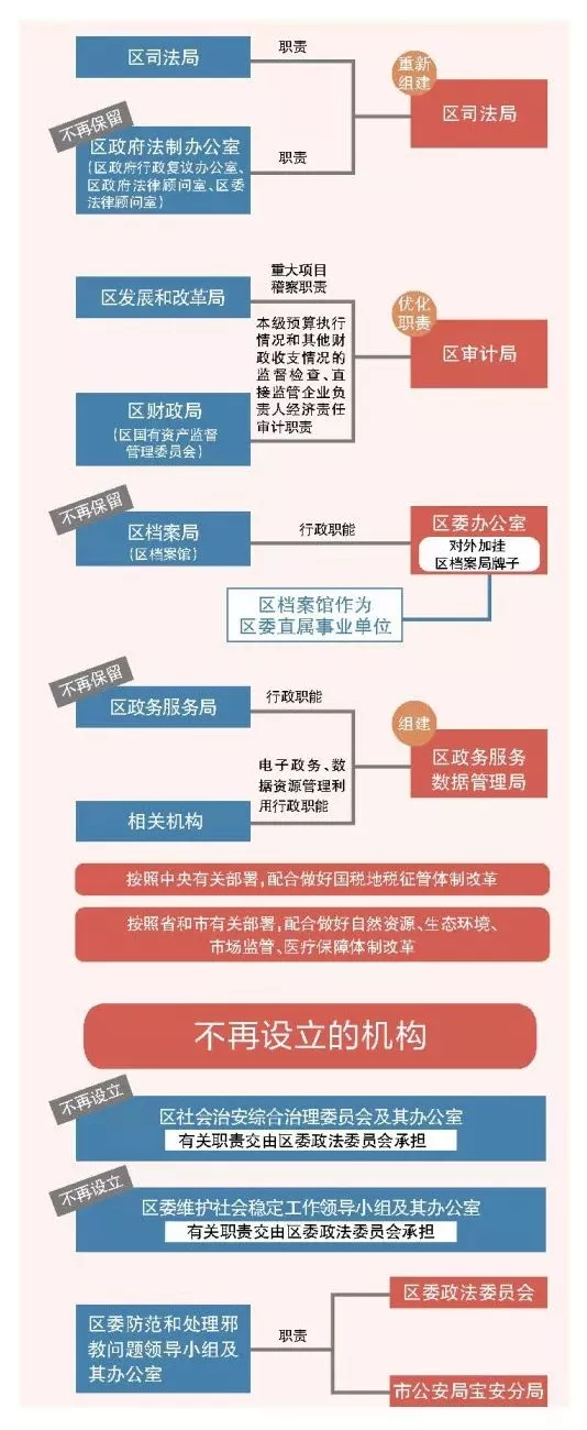 区委高度重视机构改革工作,认真贯彻落实党的十九大和十九届二中、三中全会精神,深入领会习近平总书记关于深化党和国家机构改革的重要论述,及时研究部署宝安区机构改革工作。区委专门成立了深化机构改革工作领导小组,姚任同志担任组长。方案起草过程中,领导小组办公室深入开展调研,对全区机构编制情况全面盘点摸底,充分听取意见建议,与市保持密切沟通,准确把握改革政策口径。经认真研究,反复讨论,形成了方案。2019年1月17日,区委常委会审议通过了方案,并按程序上报省市审批。2019年1月28日,省委正式批准方案。