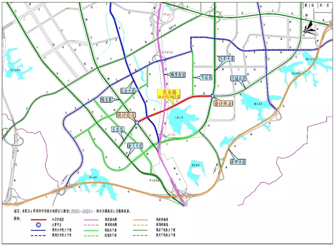 民乐路市政工程,位于深圳市中部综合组团境内的民治街道及坂田街道,道路呈东西走向,西起梅龙路,向东跨梅观高速后由现状民治水库北侧经过,终点至五和大道。