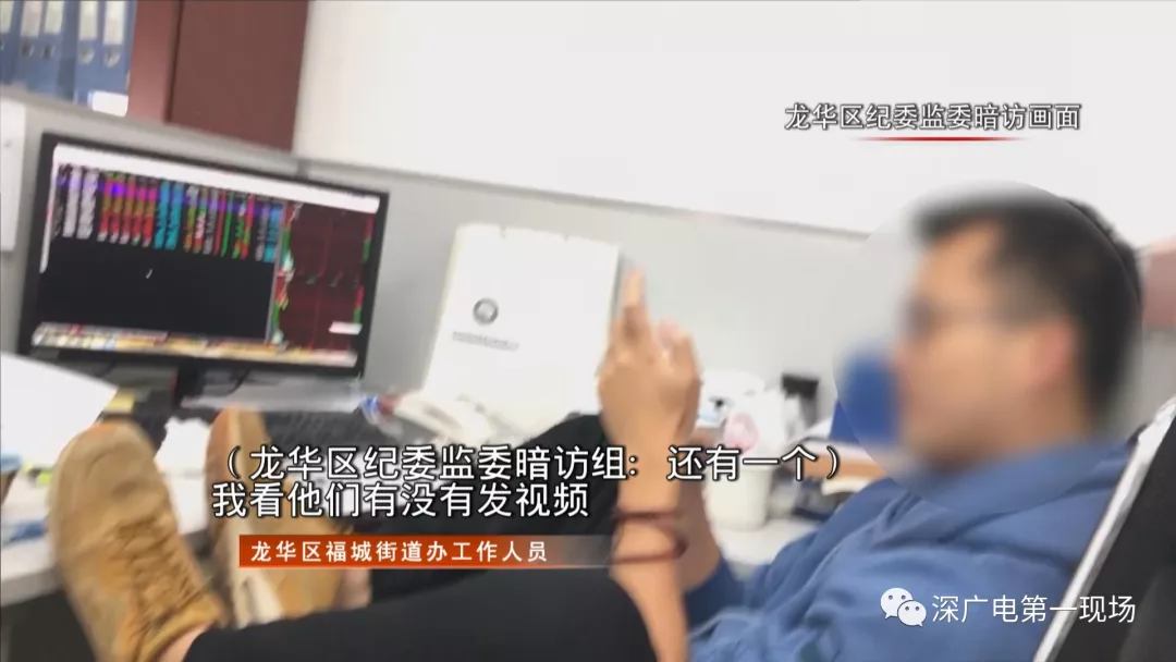但暗访组在调查中发现,福城街道建筑工程事务中心有一名工作人员上班时间把腿翘到桌子上玩手机、看股票。