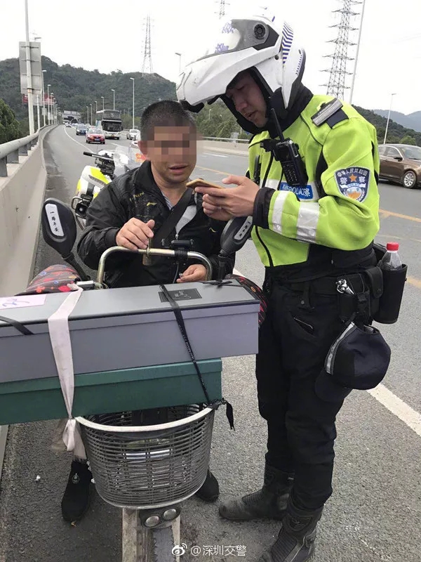 2月14日上午,深圳交警巡逻至南坪快速长岭陂大桥时发现一辆非机动车上快速路。上前询问后得知,男子是帮客户送礼物的,不料却迷路了,这才误闯了快速路。蜀黍对其教育后,迅速将当事人护送下快速路路口。
