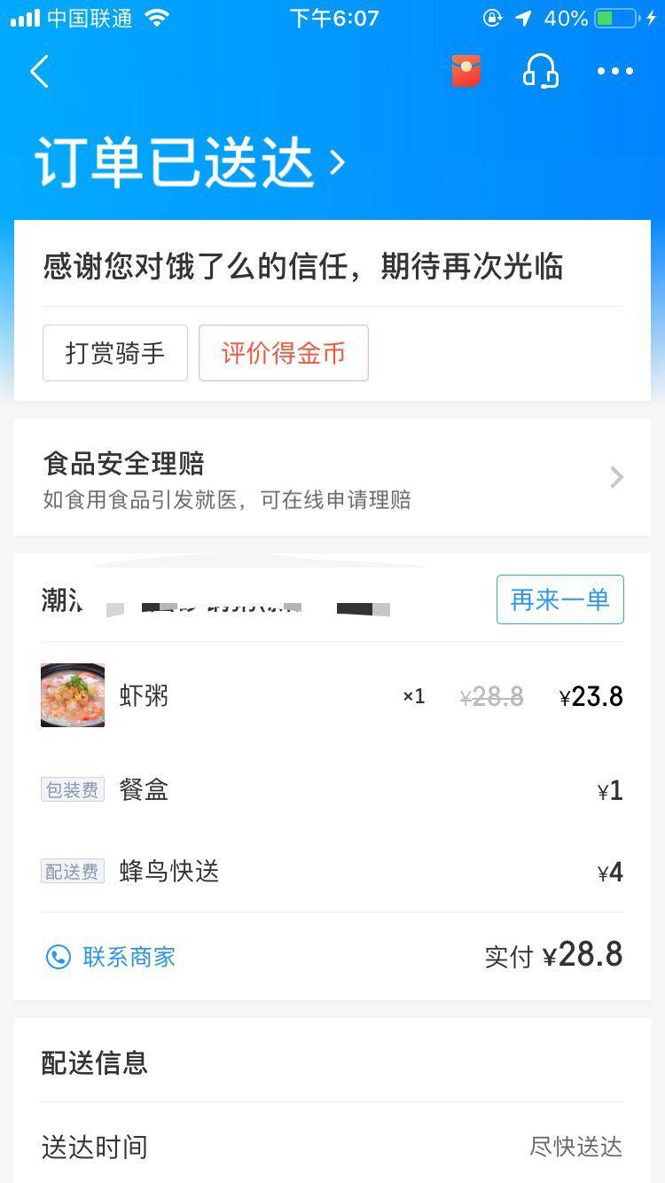 2月12日上午10点多,市民黄先生在饿了么外卖平台点了一份潮汕砂锅粥。2个小时后,肚子快饿瘪的黄先生等到了外卖小哥的电话。外卖小哥告诉他,外卖在电动车上被偷了,对此很抱歉,麻烦黄先生重新点餐,并希望添加他的微信进行赔偿。