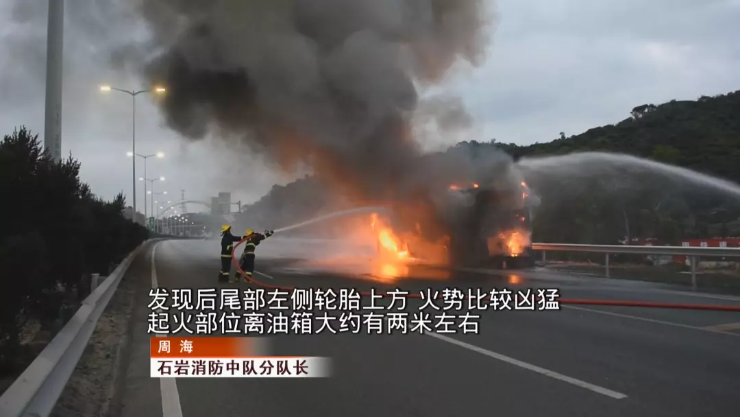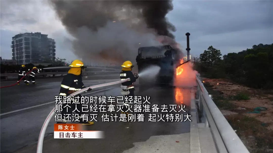 由于陈小姐及时报警,石岩消防中队官兵在起火不久后便到达现场。到场后,消防立即要求还在救火的两名司机撤离。