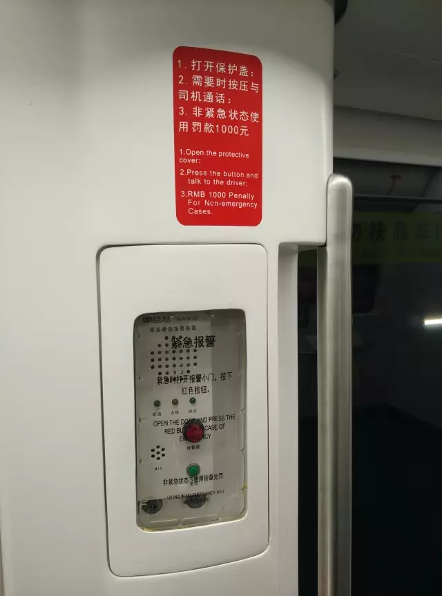 客室紧急对讲装置安装于客室车门左侧,每节车设有4个,在紧急情况(如发生乘客身体不适、争执或者衣物被车门夹住等情况)下,乘客可打开报警小门,根据防护罩上提示进行操作,与司机进行对话。