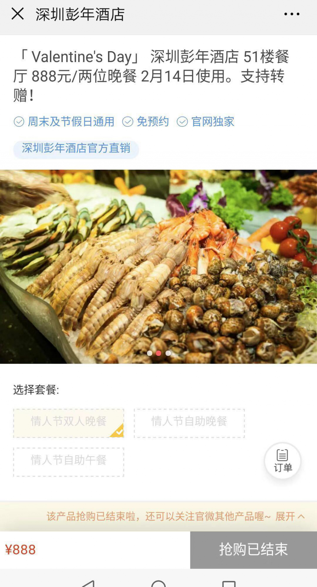 梅先生家住罗湖区,2月14日情人节将至,他打算和女朋友找一个有节日气氛的地方共进晚餐。2月13日,梅先生在深圳彭年酒店的微信公众号上抢购了一个888元情人节双人晚餐,并支付了所有费用。据了解,该情人节双人晚餐是该酒店推出的"Valentine’ s Day"51楼餐厅888元 /两位晚餐,套餐内容包含情人节自助晚餐、小提琴表演、晚餐抽奖,其中特等奖为总统套房(限2月14日使用),还有一至五等奖5个奖项。