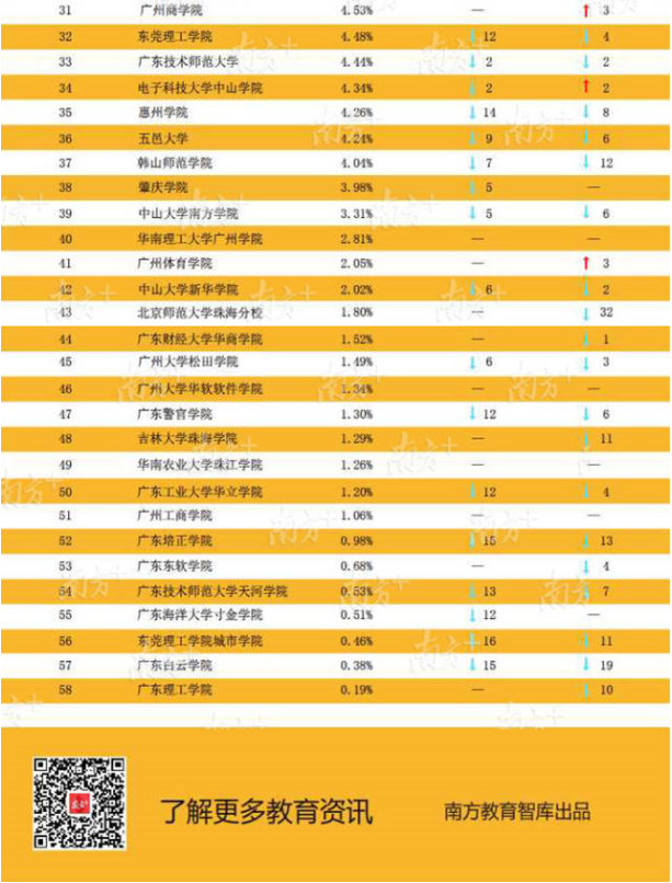 在发布“薪酬榜”后(点击查看“薪酬榜”),今天南方教育智库继续独家推出广东高校“升学榜”,梳理全省123所高校发布的《2018年毕业生就业质量年度报告》的关键数据,聚焦毕业生的深造路径和升学比例。其中南方医科大学、中山大学、广州医科大学本科毕业生国内升学率位列前3名,均超过33%。