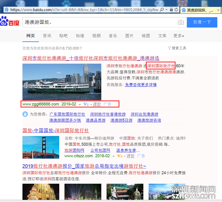 深圳市消委会模拟消费者网络搜索实际使用场景,在百度搜索中搜索“港澳游国旅”等关键词,进行了专项测试调查。调查发现,搜素“港澳游国旅”等关键词时搜索页面会出现加V等级认证的旅行社广告信息,但经核实,“深圳信用网”商事主体登记信息中并无该企业。