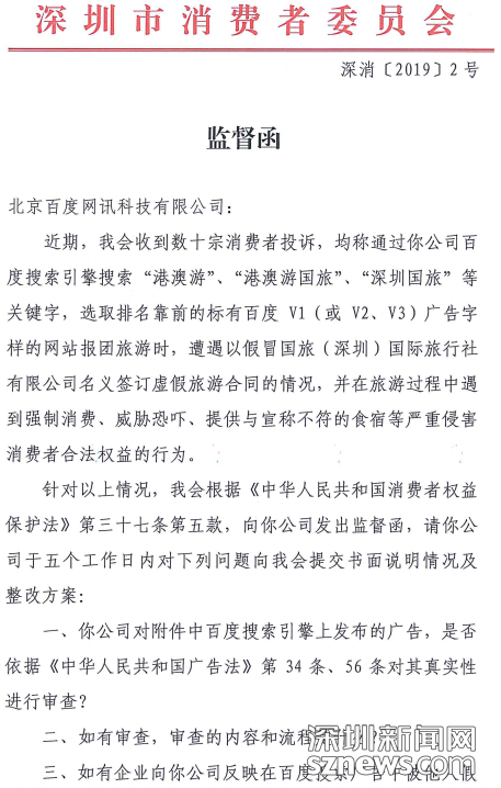 2月26日上午,深圳市消费者委员会(以下简称“深圳市消委会”)就春节期间,不少外地消费者通过百度搜索广告报名港澳游“野马”旅行社上当被骗的问题,召开港澳游“野马”旅行社投诉调查情况通报会,通报投诉调查进展情况。