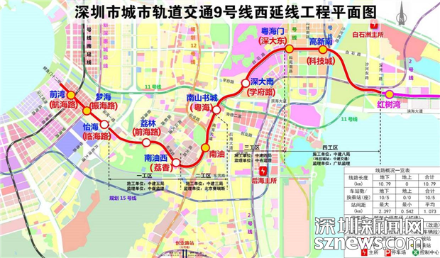 据了解,地铁9号线西延线东起红树湾南站,经深圳湾至前海湾,终点为前湾站,与5号线南延线换乘。线路全长约10.8千米,设车站10座,全线采用地下敷设方式。