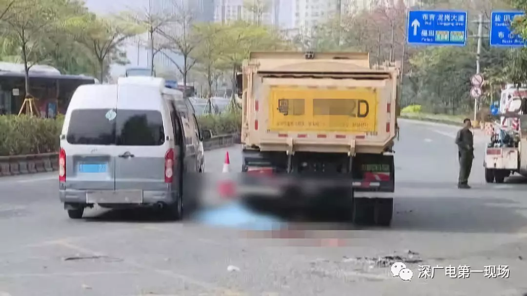 下午3点左右,第一现场记者赶到事发现场,文锦北路与水贝二路交界处的路口。肇事泥头车车头朝北停在路边,左后轮下方及后面一片血肉模糊,遇难者的遗体还被压在下方。