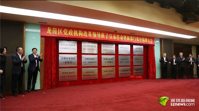 此次机构改革领导班子宣布任命及新部门集中揭牌大会,龙岗区委共集中宣布了15家区党政机构54名新调整任职的领导班子成员。在干部任命和揭牌同步进行的同时,区领导的分工也随即立即调整,与新机构组建保持了同步。