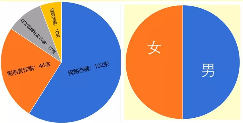 其中,以网购和刷单诈骗占比最大,受害学生男女比例基本持平。