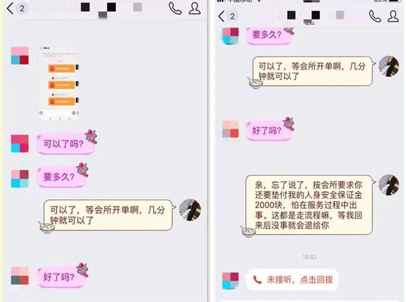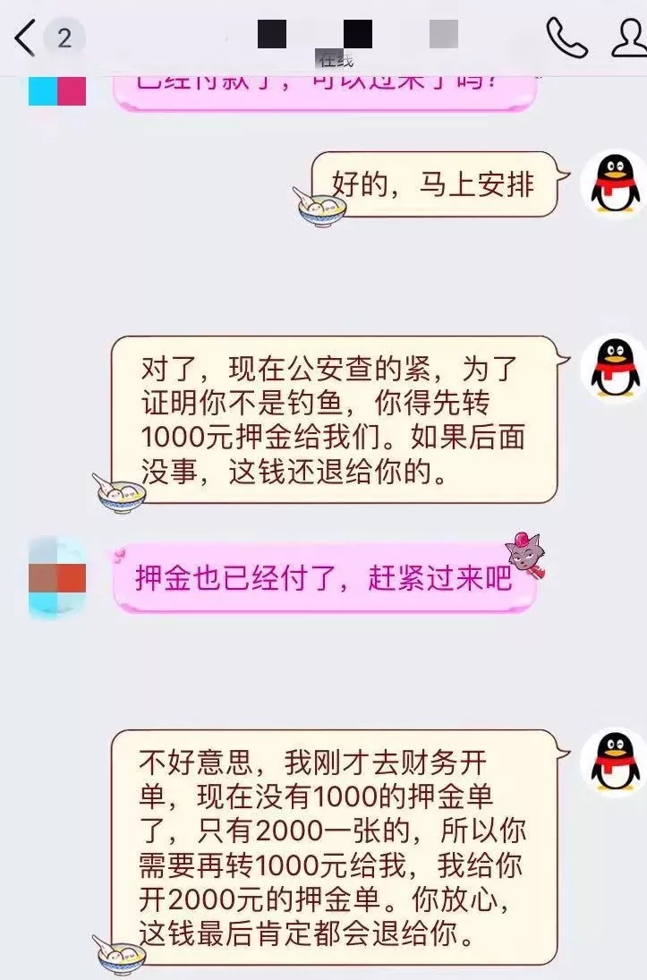 转账后,小李同学到一酒店开好房间,静等“小妹”上门,但此时,对方要求再交1000元“风险押金”才能安排“小妹”过来。