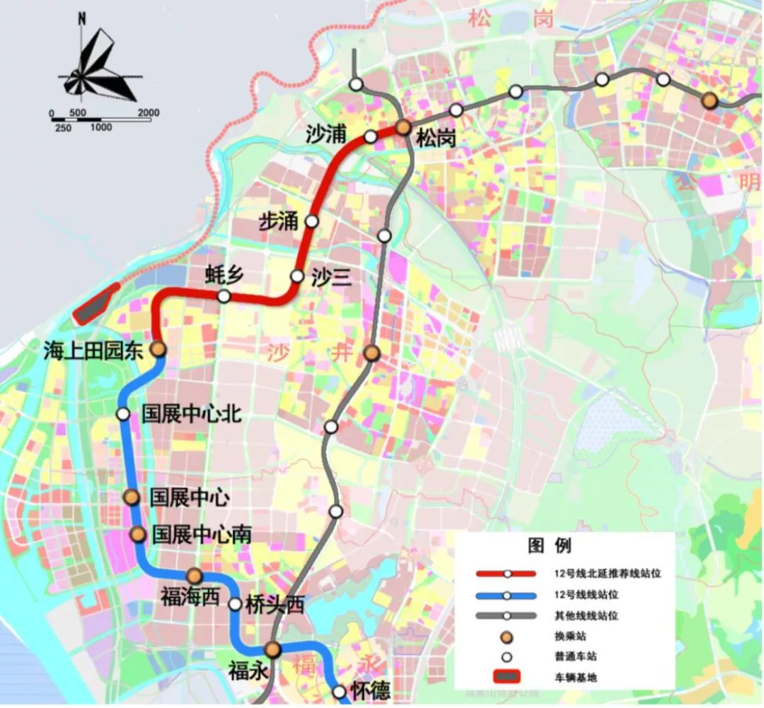 12号线北延线由在建地铁12号线海上田园东站后,至沙江路与宝安大道交叉口前设置松岗站,与在建地铁6号线和既有地铁11号线换乘。全长约8.2公里,采用地下敷设。