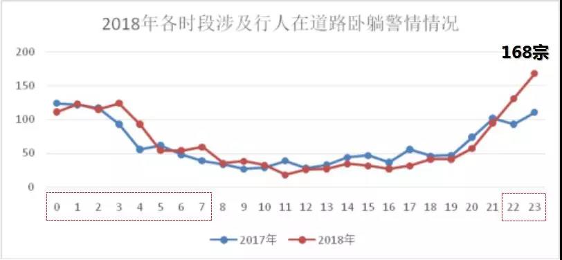 2018年接报涉及行人卧躺在道路警情中,最高峰值在夜间23时,共接报警情168宗,高发时段在22时至次日7时,共接报警情1032宗。