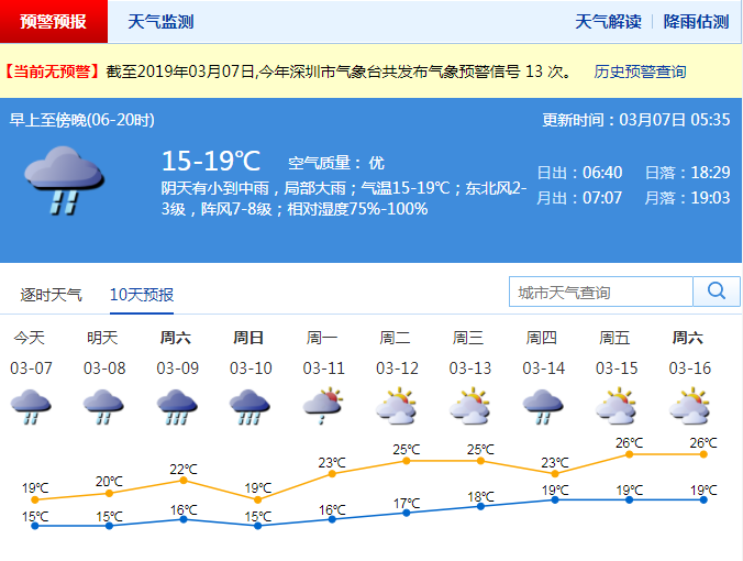 气象局提醒市民,3月6日至3月12日,深圳市流感指数为Ⅲ级(较易发生),未来一周本市处于流感流行期,流感活动较强,流感病人较多,请保持室内环境卫生,经常开窗通风;保持健康饮食、适量运动及充足休息;勤洗手,打喷嚏或咳嗽时用手帕或纸巾掩住口鼻;尽量避免接触流感患者,如需接触应配戴口罩;建议老人、儿童与慢性病患者注射流感疫苗。