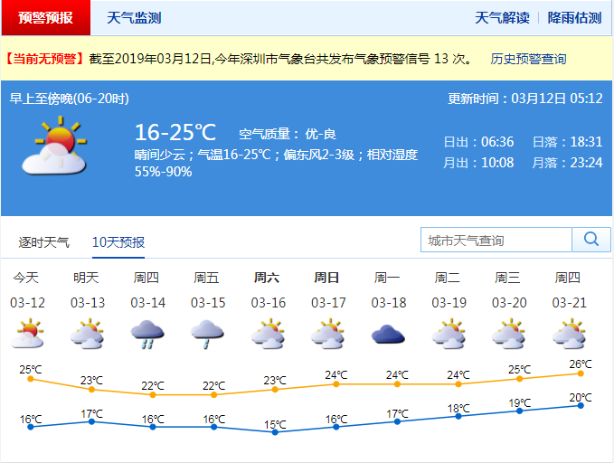 深圳新闻网2019年3月12日讯 今天白天,全市天气大致晴好,可见阳光,早晚最低气温徘徊在16℃左右,中午前后最高气温升至25℃左右。天气晴好,适合洗晒。但昼夜温差大,注意及时增添衣物。