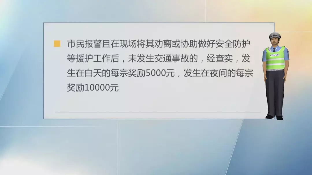 第三种则是市民报警且在现场将其劝离或协助做好安全防护等援护工作后,未发生交通事故的,经查实,发生在白天的每宗奖励5000元,发生在夜间的每宗奖励10000元。