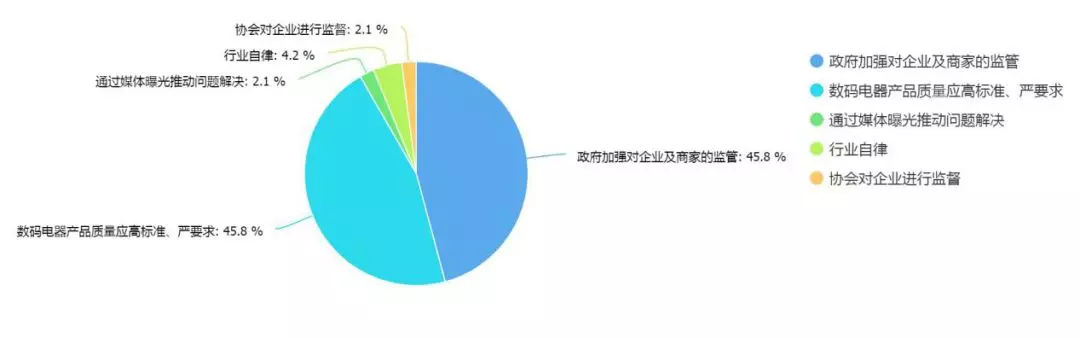 针对目前数码家电行业中存在的相关问题,有45.8%的消费者建议通过政府加强对企业及商家的监管,另有部分网民建议数码家电类产品应该设立更高的的标准,对企业应该提出更高的要求。