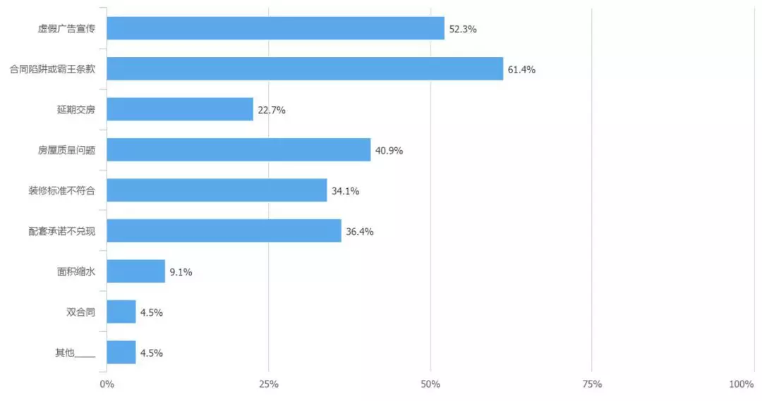 调查结果显示,房产纠纷主要集中在购买一手房、二手房和房屋装修上,分别占比38.6%、27.3%、27.3%,而且将近70%的消费者对房产交易过程中的相关知识和风险只是了解一般。同时,消费者在新建商品房和二手房交易过程中遇到的纠纷在问卷结果中显示都是多方面的。其中,新建商品房交易陷阱主要是“合同陷阱或霸王条款”、“虚假广告宣传”;二手房交易陷阱主要是“隐瞒房屋缺陷”。针对如何避免购房纠纷,50%以上的消费者认为“购房前咨询朋友、专家”和“购房前多学习房产知识,防止受骗”是最好的办法。