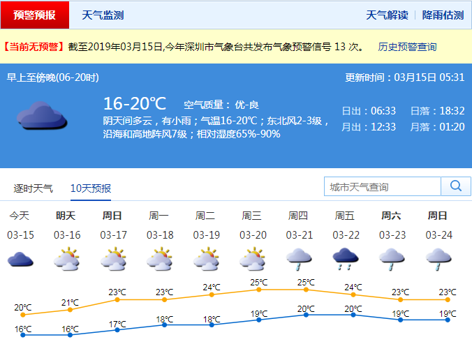 深圳新闻网2019年3月15日讯 太阳再次“流浪”?这次不会“流浪”太久,周末阳光又要来了!据深圳市气象台消息,今日深圳阴天为主,有小雨;气温16-19℃。早晨天气较凉,注意添衣保暖;部分时间有小雨,外出最好带把伞。
