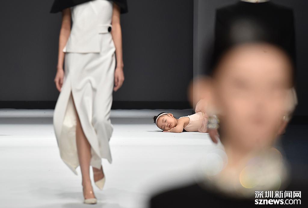 品牌OBBLIGATO展示环节,一位参展的小孩子趴在T台上睡着了