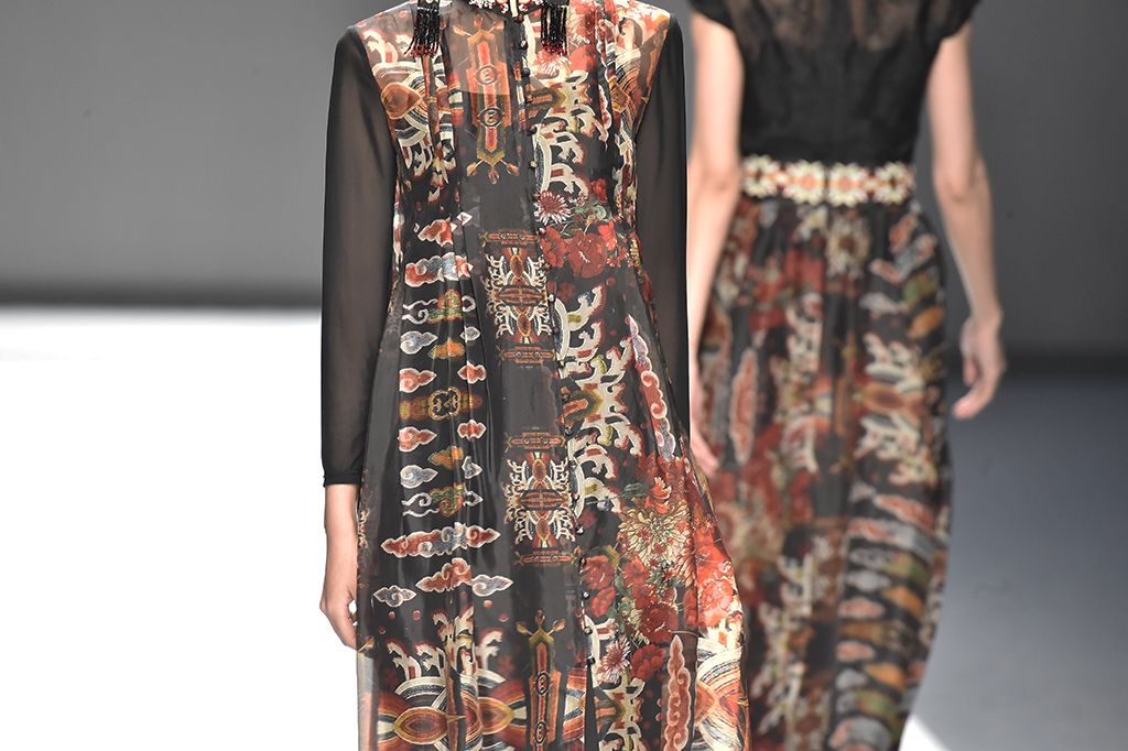模特正在展示品牌Sunshine见花开的服装服装凸显东方特色