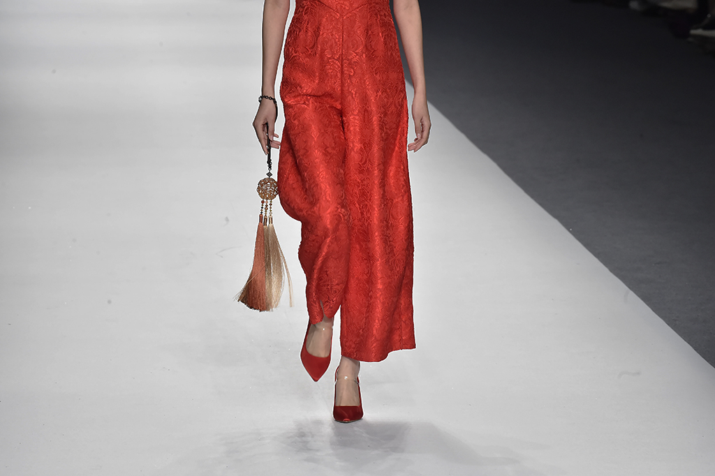 模特正在展示品牌Sunshine见花开的服装 红色的服装尽显东方美感