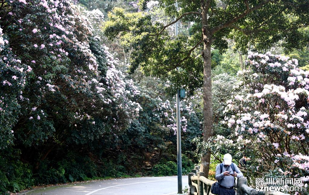梧桐山成踏春赏花打卡点,市民用相机记录下毛棉杜鹃之美。