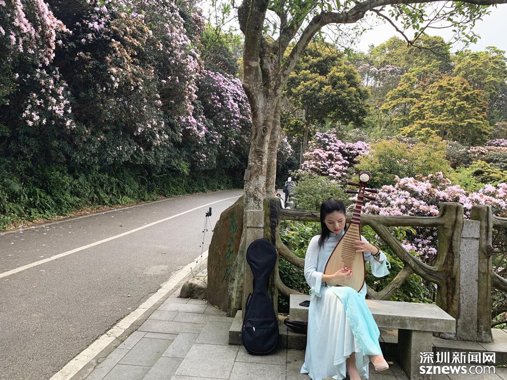 毛棉杜鹃从中,美女身穿古装手弹琵琶,美如画。