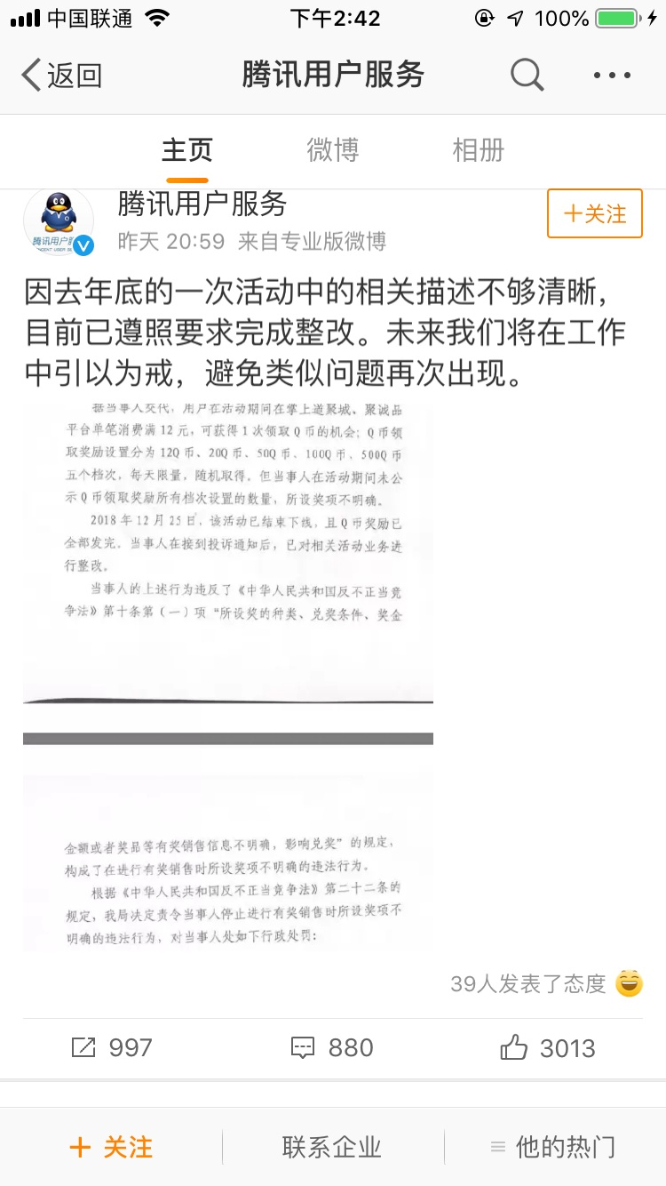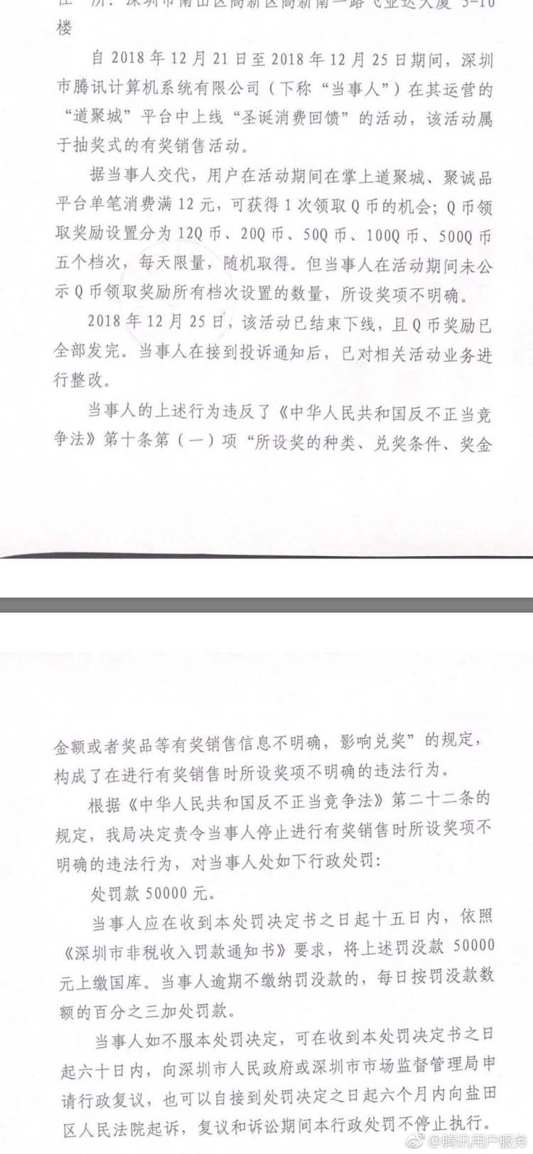 为解答网友疑惑,当天晚间,微博账号腾讯用户服务公开发布了该处罚决定书,决定书中提到,2018年12月21日 -25日期间,深圳市腾讯计算机系统有限公司(下称"当事人")在其运营的"道聚城"平台中上线"圣诞消费回馈"的活动,该活动属于抽奖式的有奖销售活动。