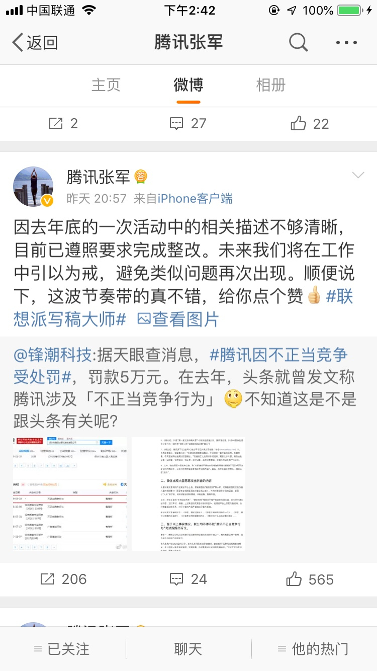 数据显示,腾讯在前两次受到行政处罚的类型均为不正当竞争。微博账号 @锋潮科技发文称,去年,今日头条就曾发文称腾讯设计不正当竞争行为,不知道这是不是跟头条有关。对该揣测,张军还在微博中调侃工作人员不早公布缘由,导致该事件被人带节奏。