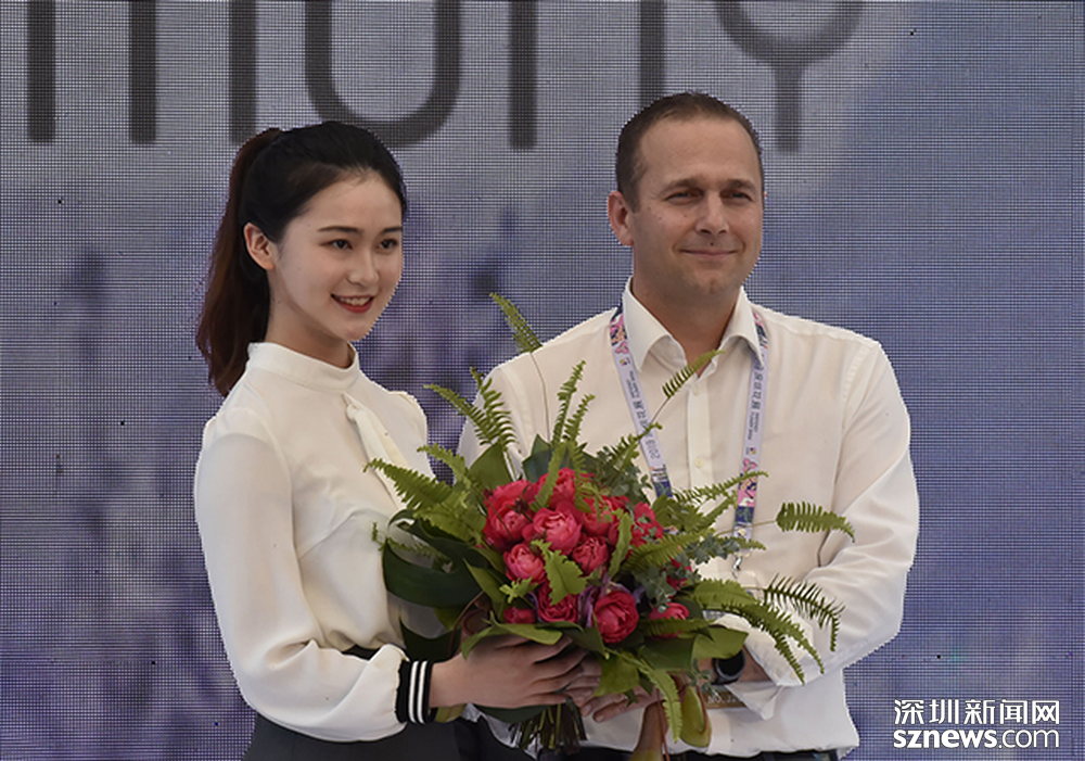 玫昂国际月季公司中国区销售总经理Matthias Meilland将“深圳红”赠予深圳学生代表