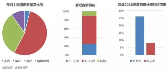 报告着重以夜店、清吧、餐吧、精酿啤酒吧为主要研究对象。其中,清吧的数量在主流酒吧业态中占比过半——2018年,清吧在深圳超过600家,占据市场的54%,开业量超过130家,闭店数则超过40家,精细运营成为追求现象级爆红的“网红”酒吧发展的主要瓶颈。