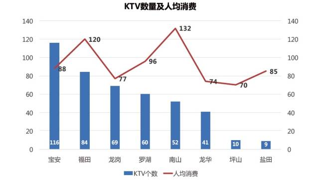 南山区为深圳科技龙头,聚集了深圳最具消费实力的客群,住宅小区高档,因此南山区的KTV人均消费水平整体较高。