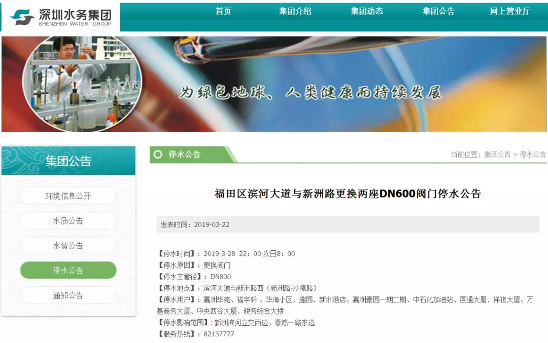 深圳新闻网2019年3月27日讯(记者 施冰冰)深圳水务集团官网3月22日发布停水公告,该公告显示本周四晚(28日)10点起福田新洲滨河立交西边、泰然一路东边区域要停水,提醒市民做好蓄水准备。