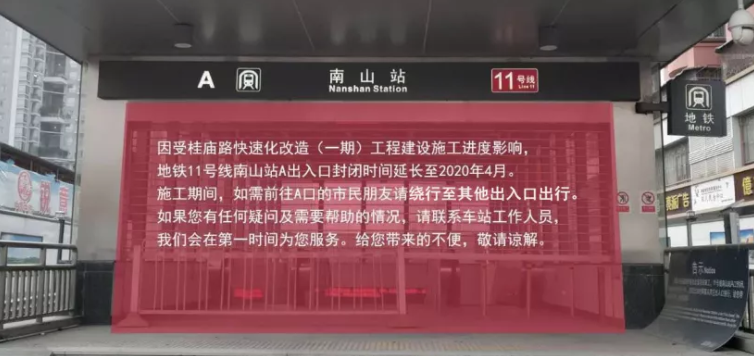 乘客们也请注意:11号线南山站A出入口延长封闭时间至2020年4月
