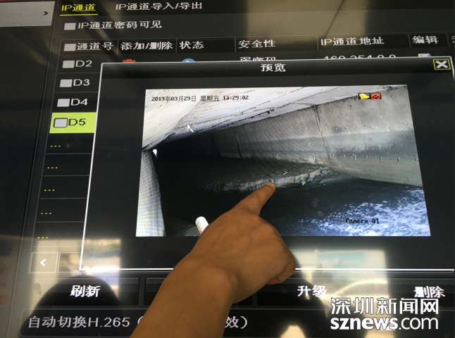 工作人员向记者介绍淤泥淤积情况,监控中显示5米余高的暗渠只剩2米左右排水高度。