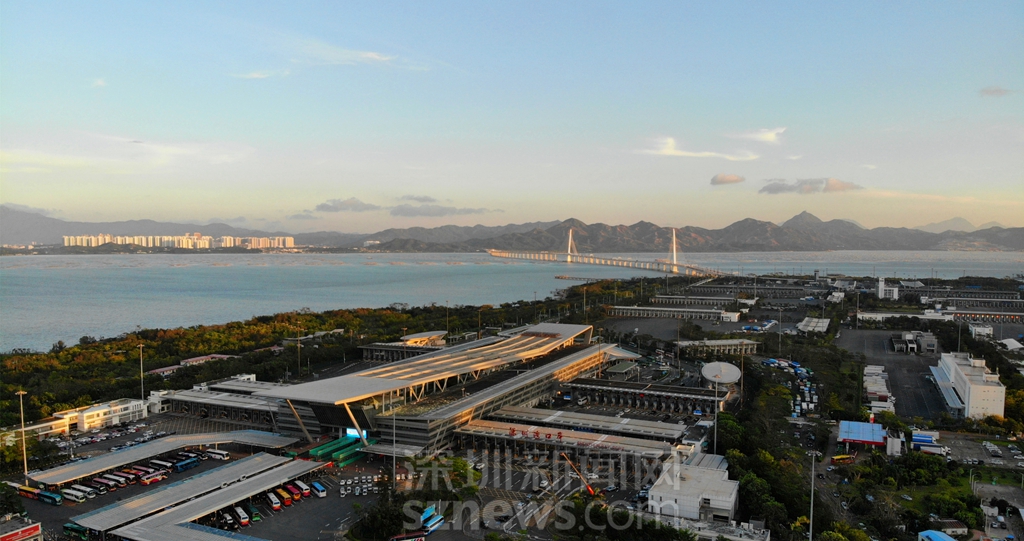 深圳湾口岸和远处的深圳湾大桥