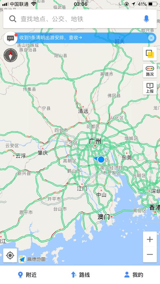 最后看看我们大广东的路况,凌晨3点06分,广州周边明显多了许多红色“毛毛虫”,每一条“毛毛虫”的迷人红色,想必都是各位司机大佬用车灯刷出来的!