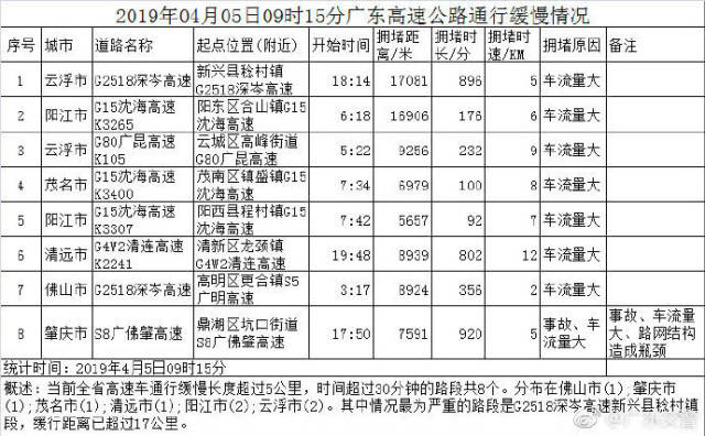广东交警部门此前预计,从4月4日至7日全省高速公路车流都将持续处于高位,出行最高峰出现在4月4日15时至5日凌晨2时。4月5日9时15分,广东高速车通行缓慢长度超过5公里,时间超过30分钟的路段共8个。