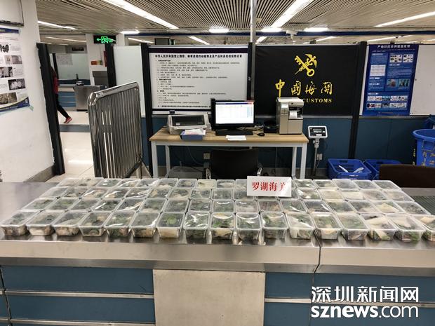 3月21日晚,两名男性旅客各自提着两个外形相似的大行李袋及一副鱼竿,从罗湖口岸入境。在对其行李进行X光机检查时,海关关员在机检图像中发现了异常,图像显示四个袋子中的物品呈现生物特征,而且有若干个相同的容器包装着,于是海关关员要求两名旅客打开行李袋进行详细检查。