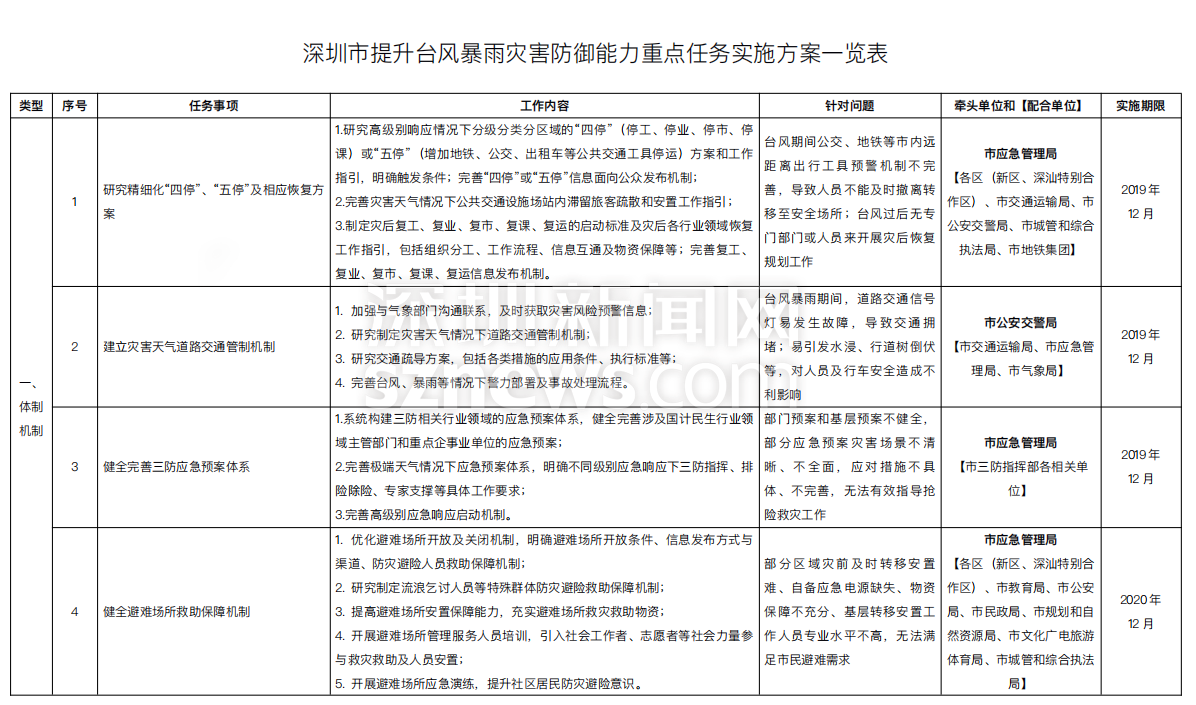 同时,还将建立灾害天气道路交通管制机制、健全完善三防应急预案体系等,并在2019年12月前开始实施;健全避难场所救助保障机制、完善巨灾保险保障机制、健全深汕特别合作区突发事件预警信息发布机制等,在2020年12月前开始实施。所有体制机制都由主要责任单位负责牵头,相关单位配合建立实施。
