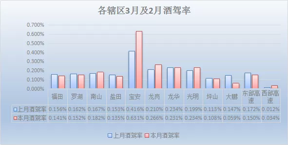按辖区进行划分:3月酒驾率最高为宝安0.631%,其次是龙岗0.266%、光明0.234%。
