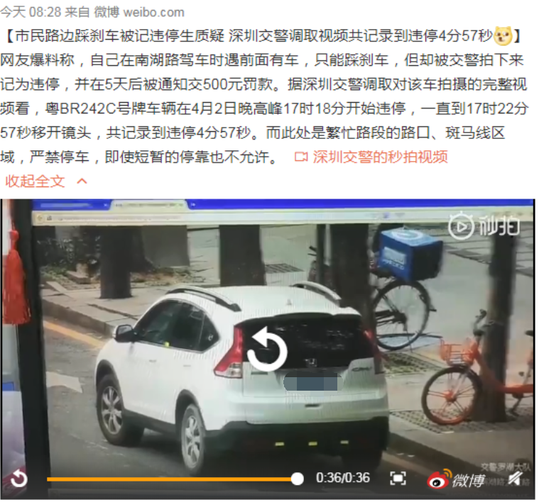 接举报后,交警查看了监控,发现该车辆违停近5分钟……