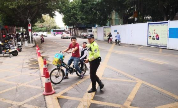 近日,深圳交警重点管理家长骑电动车接送学生不佩戴头盔现象