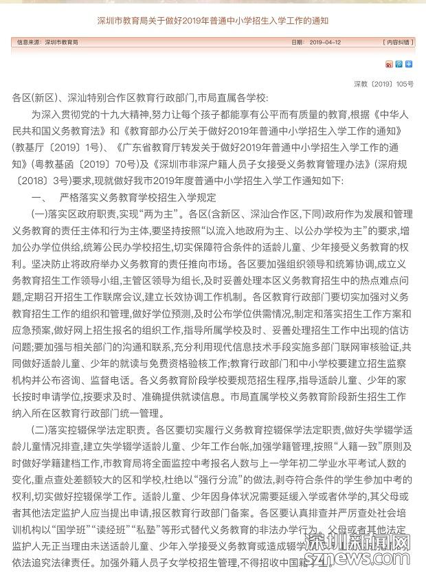 深圳新闻网4月12日讯(记者 余俐洁)4月12日,深圳市教育局召开新闻通气会,就同日发布的《深圳市教育局关于做好2019年普通中小学招生入学工作的通知》(以下简称“《通知》”)进行了详细解读。