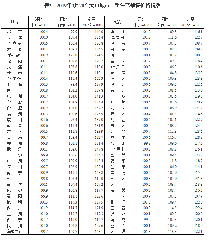 2019年3月份70个大中城市商品住宅销售价格变动情况