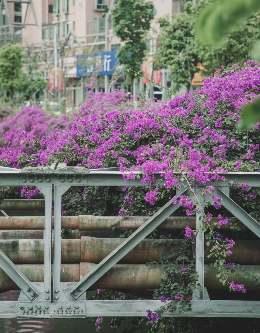 经过宝安人不懈的努力,西乡河已不见了黑臭的身影,此时盛开的红色、紫色勒杜鹃清晰地倒映在河面上。