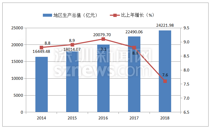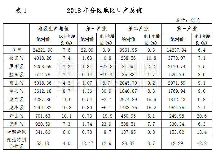 深圳新闻网2019年4月19日讯(记者 刘梦婷 通讯员 胡雪涛)4月19日,记者从深圳市统计局获悉,深圳市2018国民经济与社会发展统计公报出炉:全市实现地区生产总值24221.98亿元,比上年增长7.6%,常住人口达1302.66万人。人均可支配收入57543.60元,居民人均消费支出40535.02元。总体来看,2018年深圳经济运行稳健,主要经济指标表现良好,高质量发展扎实推进。